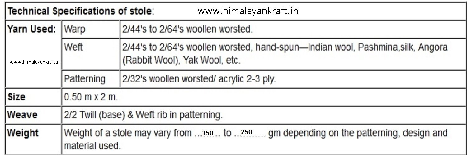 Product Lenght Width Shawl 80 40 Stole 80 30 Muffler 48 12 Lohi/Loi 100 50 All measurements are in INCHES